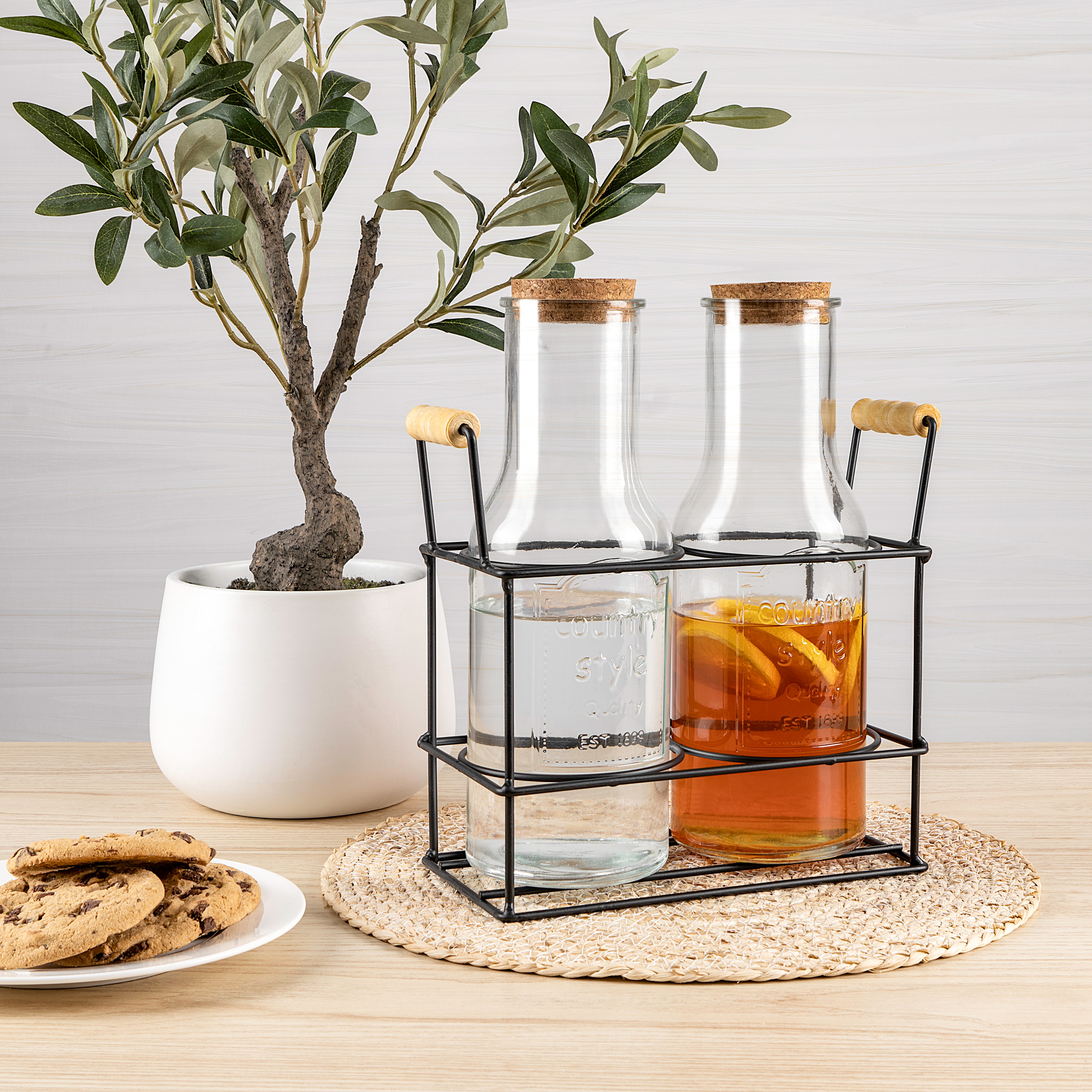 طقم قارورات زجاج من البرتو مكون من قطعتين مع حوامل معدن، حيث تتسع كل منها لـ 1380 مل، لتوفير طريقة أنيقة لتقديم مشروباتك المفضلة.