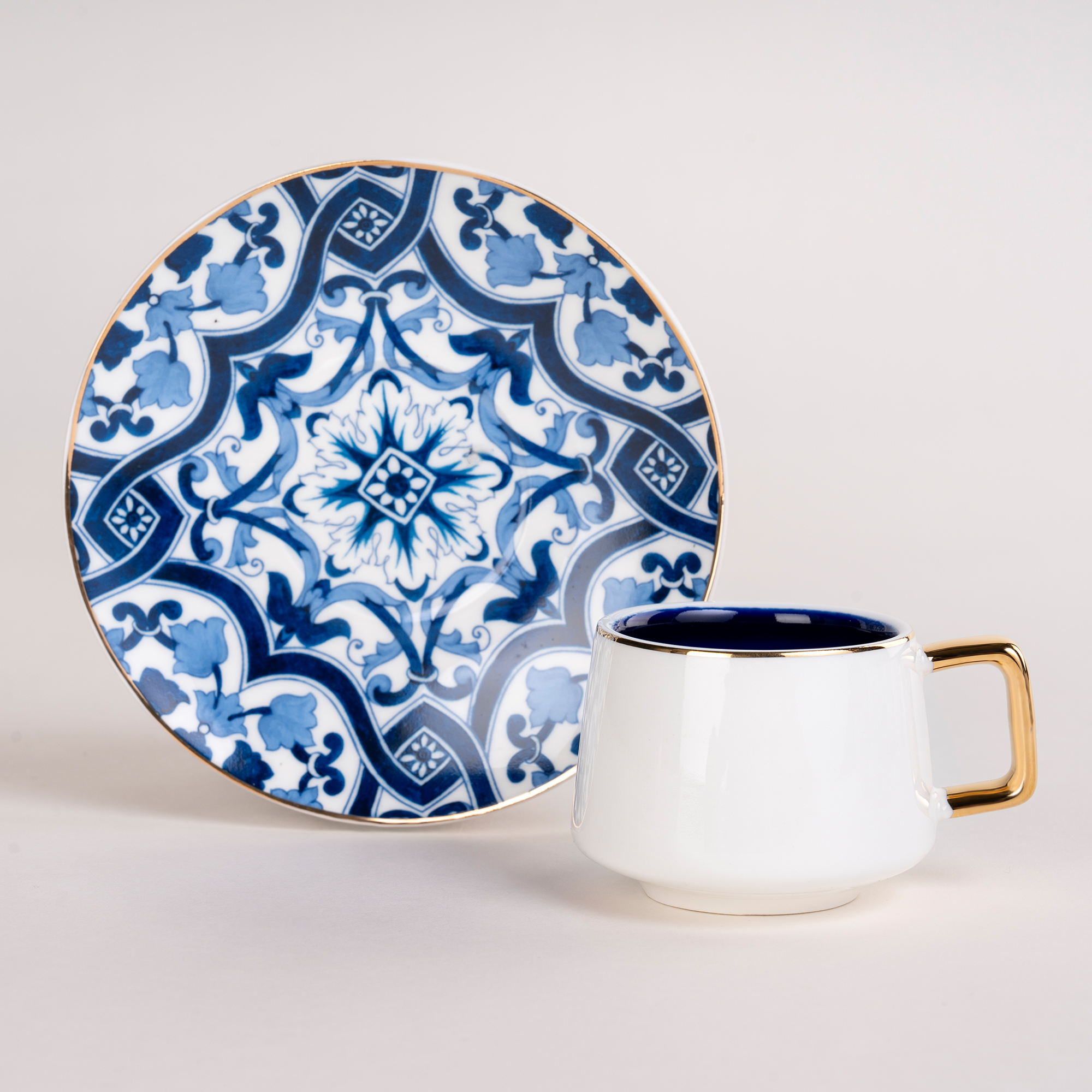 تعتبر القهوة التركية لها مكانة خاصة في عالم القهوة، لذلك نقدم لكم مع دلتي طقم فناجين قهوة تركية بورسلان يجمع بين التقاليد القديمة والتصميم الأنيق. يتكون الطقم من 12 قطعة، 6 فناجين قهوة أبيض من الخارج وأزرق من الداخل مع مقابض وحواف لون ذهبي. كما يحتوي على 6 صحون أزرق مزينة بنقوش على هيئة زهور وحواف لون ذهبي. استمتع بتذوق القهوة التركية الشهية مع دلتي.