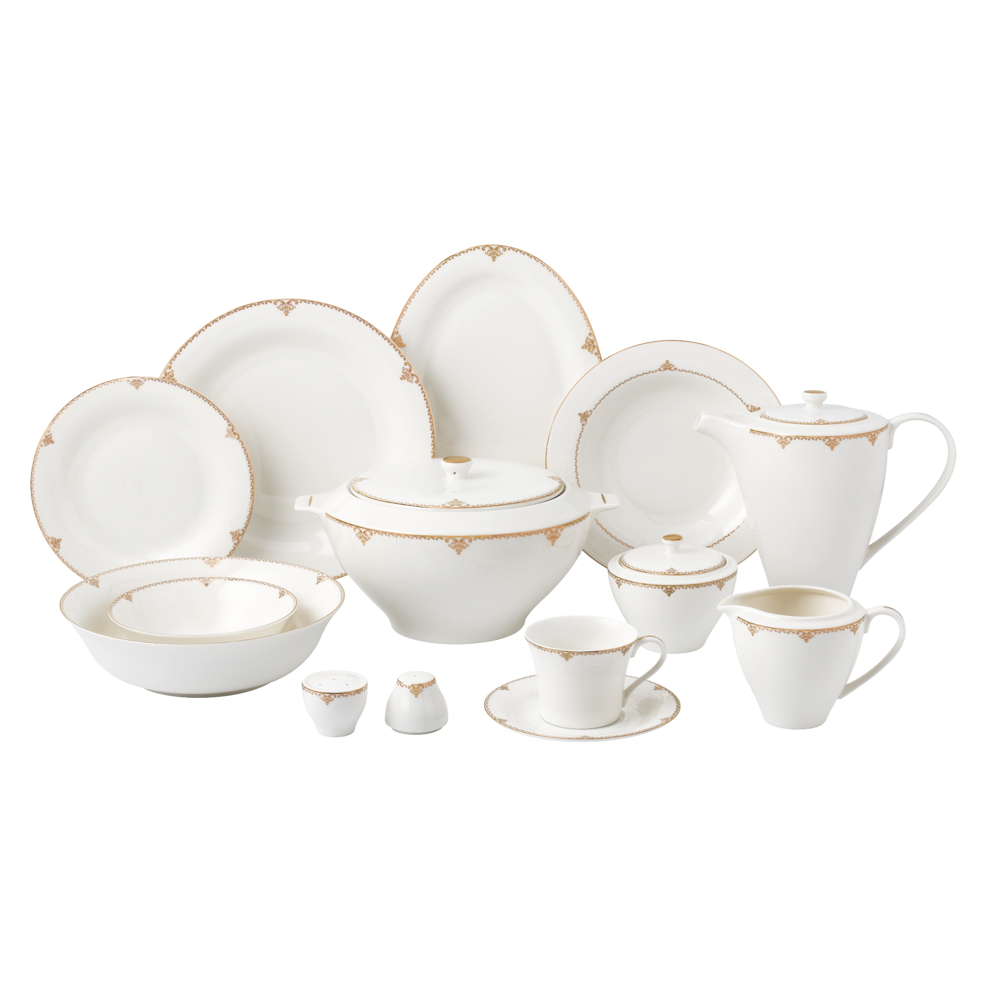 12 طبق مسطح 10.5"، 12 طبق شوربة 8.5"، 12 طبق مسطح 8"، 12صحن سلطة 6"، 12 كوب شاي، 12صحن شاي، 12 زبدية 9"، 1 طبق تقديم حساء، إبريق شاي، سكرية، طقم ملاحات 2 قطعة.