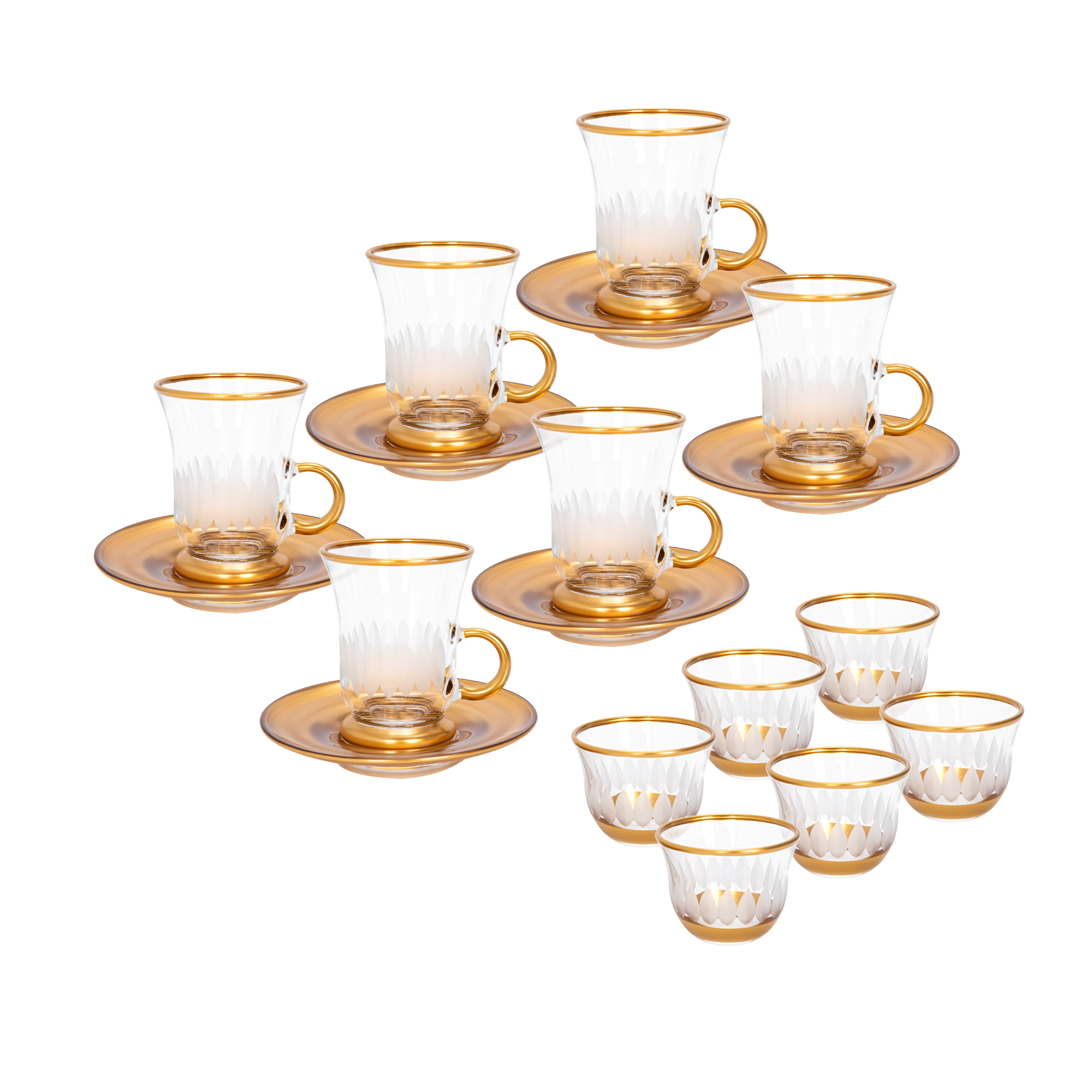 الطقم يتضمن 6 فناجين قهوة، 6 أكواب للشاي، 6 صحون