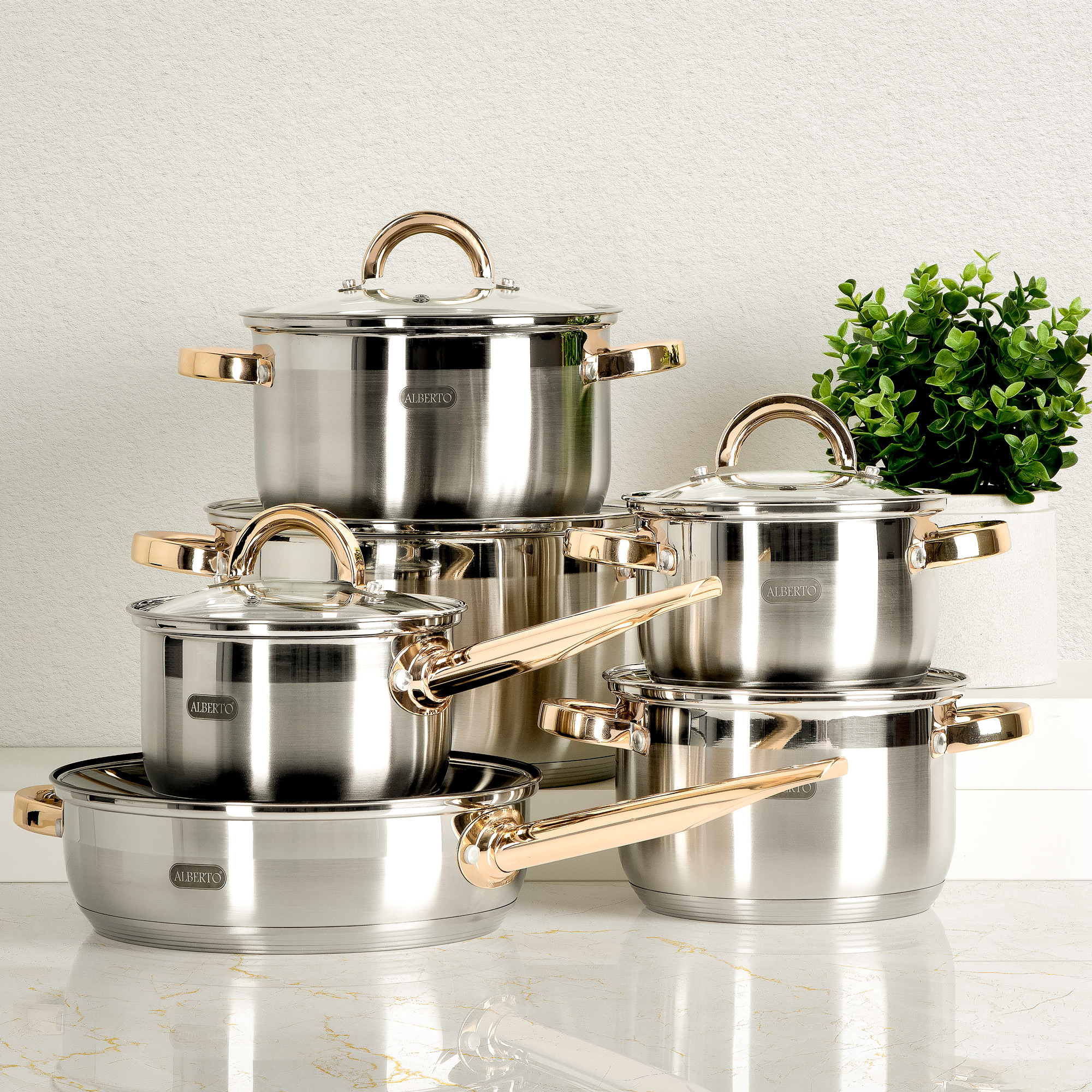 احصلي على طقم قدور فريد ومتكامل من البرتو. مصنوع من ستانلس ستيل عالي الجودة قادر على تحمل درجات حرارة عالية بالإضافة إلى توزيعها بالتساوي في كل جوانب القدر. يتكون الطقم من خمسة قدور بأحجام مختلفة مع مقلاة وأغطية زجاجية. يتميز بمسّاكات أنيقة باللون الذهبي.