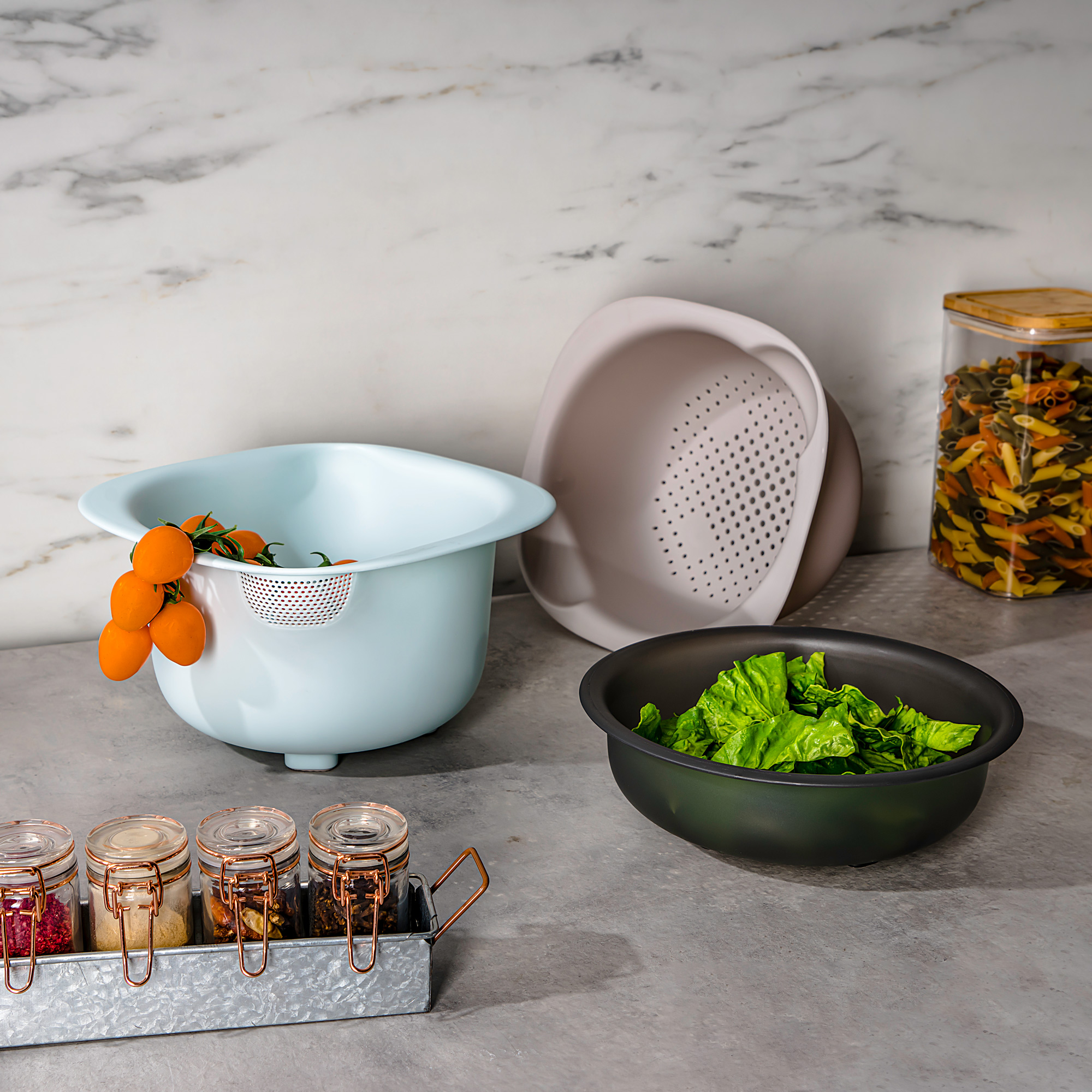 يتكون طقم أوعية الخلط من البرتو من ثلاثة ألوان وأحجام مختلفة. كما أنها قابلة للتخزين داخل بعضها البعض مما يساعد على توفير مساحة داخل أدراج المطبخ. صمم كل وعاء بقاعدة صلبة لضمان عدم الانزلاق أثناء الاستخدام.
