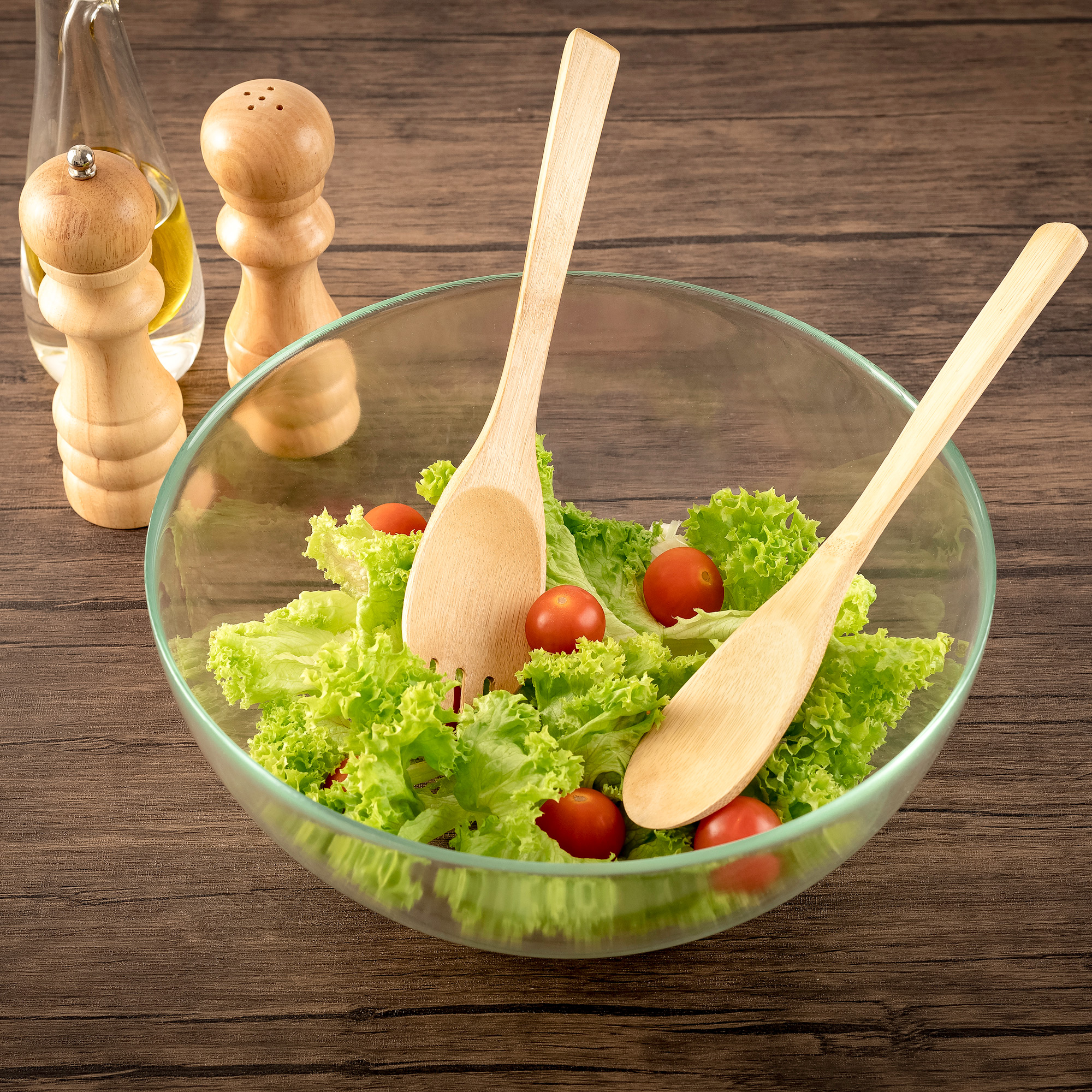 طبق تقديم زجاجي للسلطة مع ملعقتين خشبية