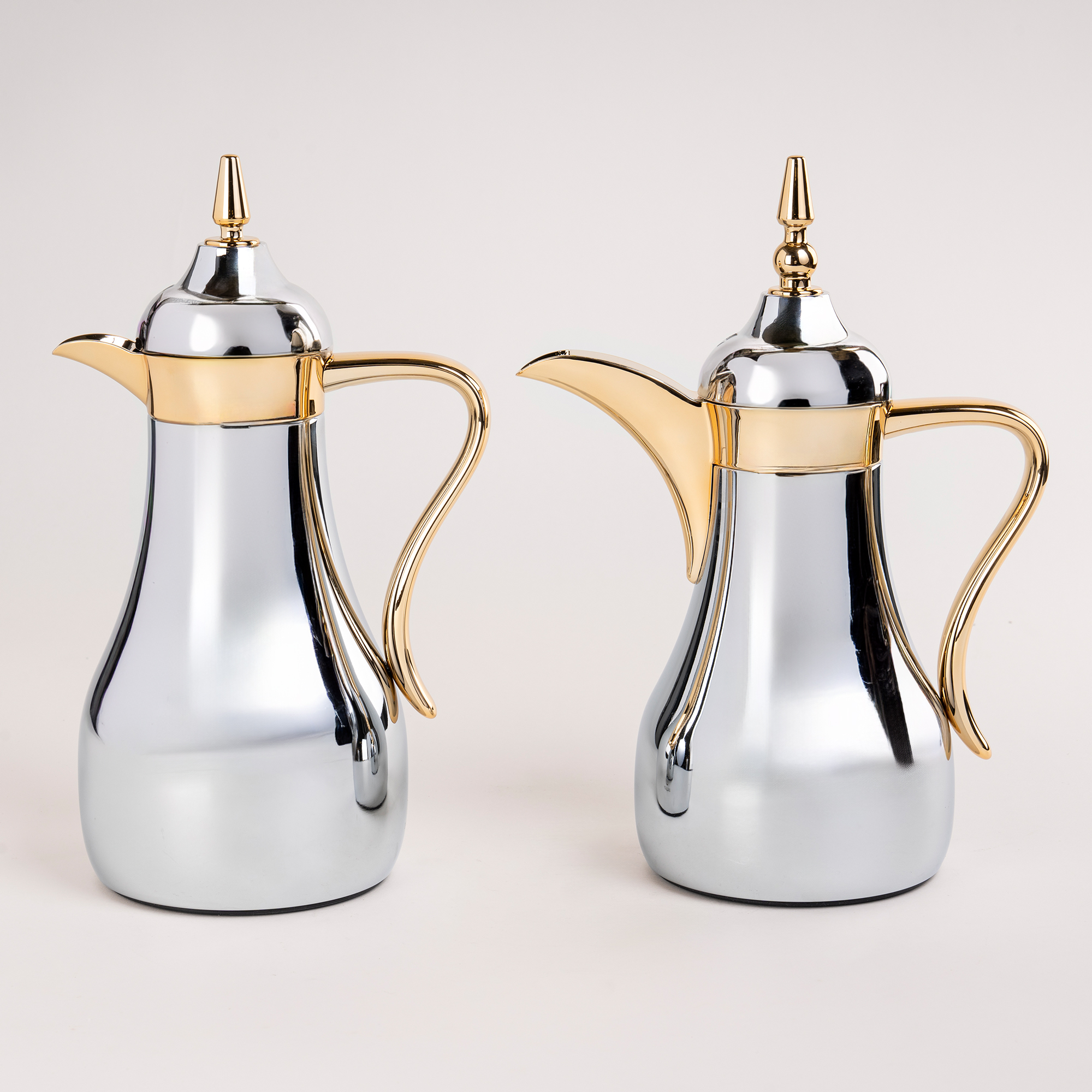 حافظي على قهوتك العربية ساخنة مع هذه الدلة المميزة بلون فضي وذهبي فاخر من دلتي. تتميز بغطاء محكم الإغلاق مزوّد بزر ضغّاط أنيق. يتكون الطقم من دلتّين بسعات مختلفة 1 و0.7 ل.