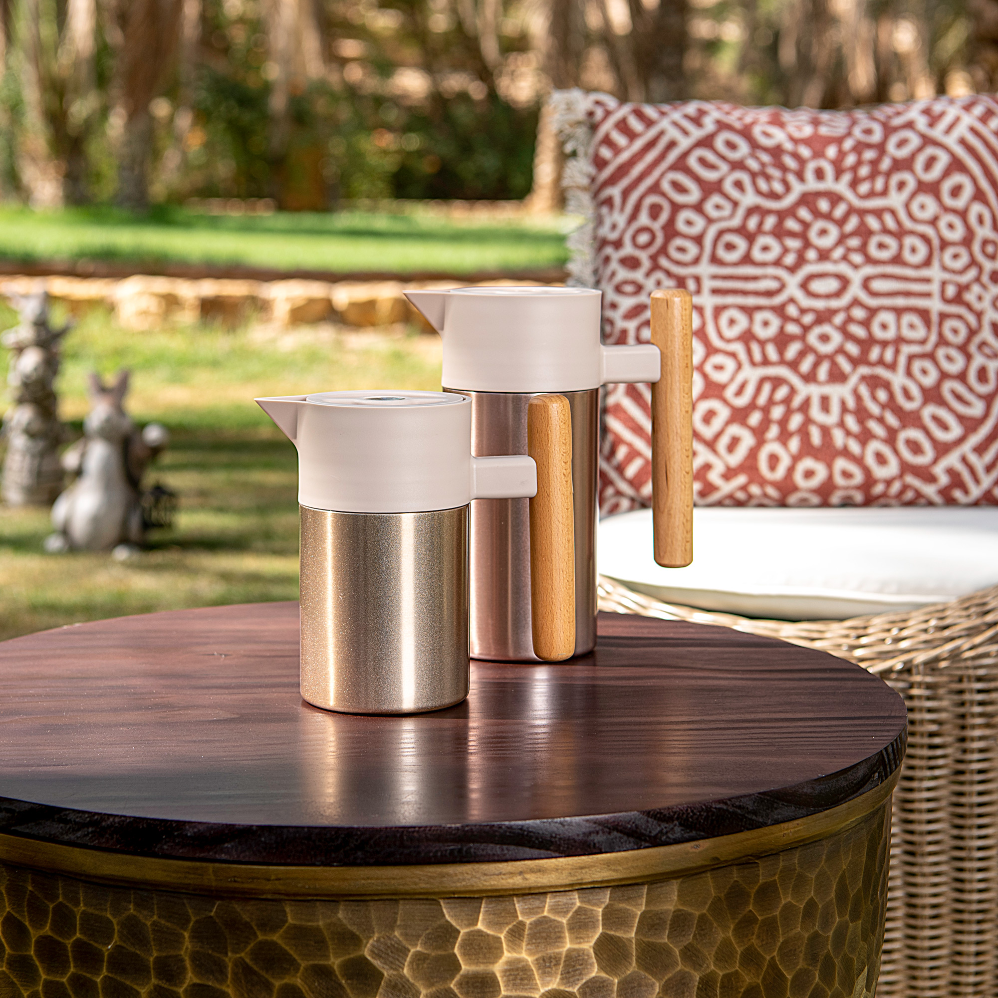 حافظي على قهوتك العربية ساخنة لفترة أطول مع هذه الدلة الفريدة بسعة 1.2ل من دلّتي. مصنوعة من ستيل عالي الجودة وتتميز بتصميم عصري باللون البيج المطفي مع مسّاكة خشبية أنيقة.