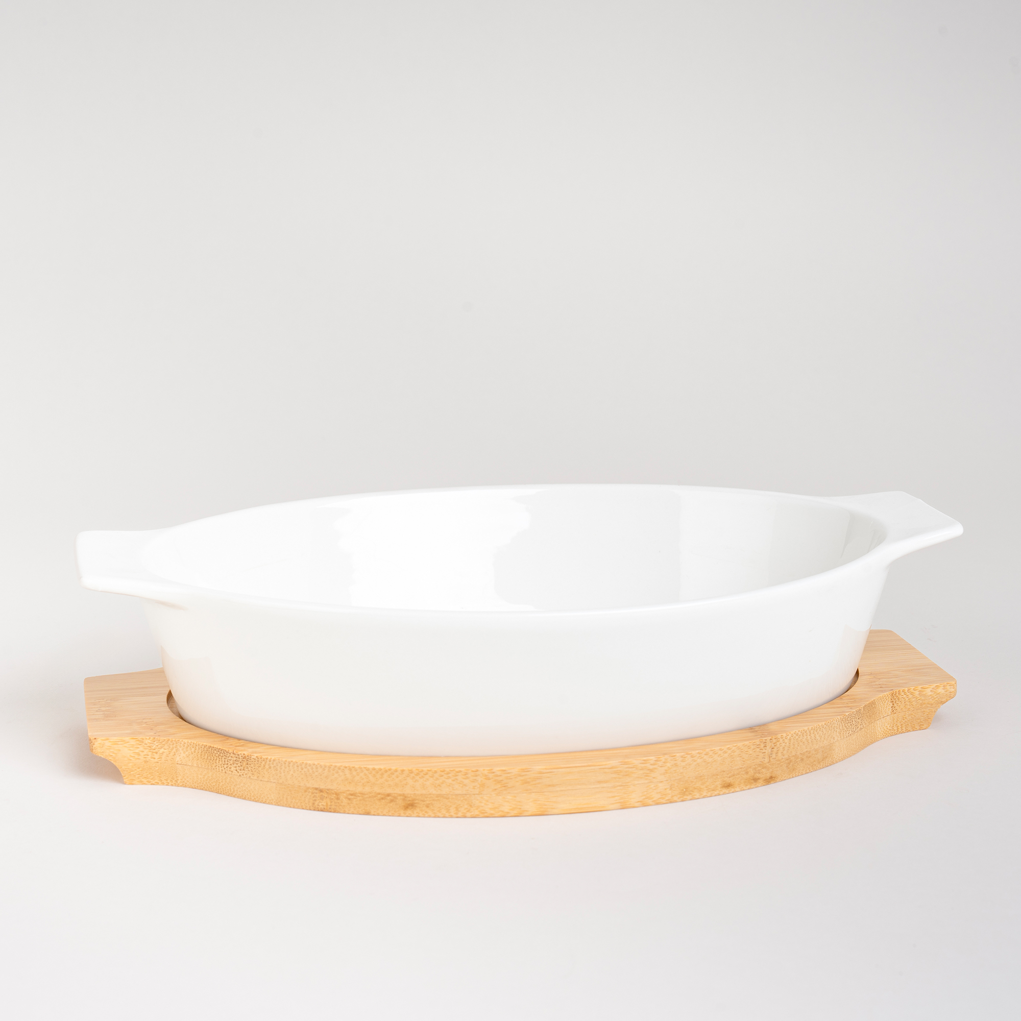 يسمح لكِ هذا الطبق البيضاوي من لا ميسا الطبخ، التسخين والتقديم دون الحاجة لنقل الطعام من صينية الخبز لطبق آخر. يتميز بتصميم أنيق وقاعدة مثالية لطاولة الطعام مصنوعة من خشب البامبو العالي الجودة.