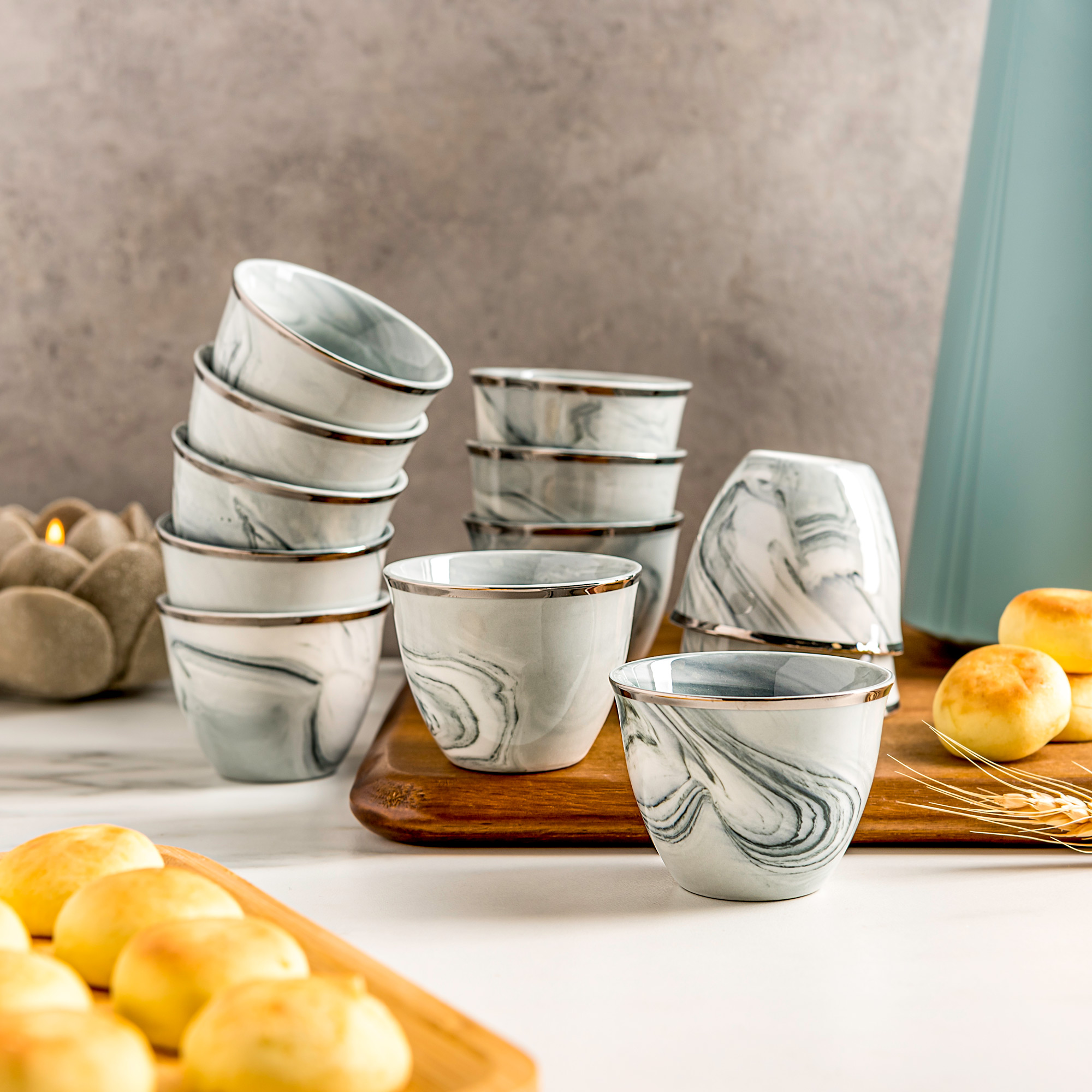 طباعة الرخام الفريدة باللون الرمادي الفاتح والخطوط الفضية الفاخرة على الأطراف تجعل هذا الطقم قطعة مثالية لإضفاء لمسة أنيقة لتشكيلة التقديم الخاصة بكِ. يتكوّن الطقم من 12 فنجان قهوة عربية.