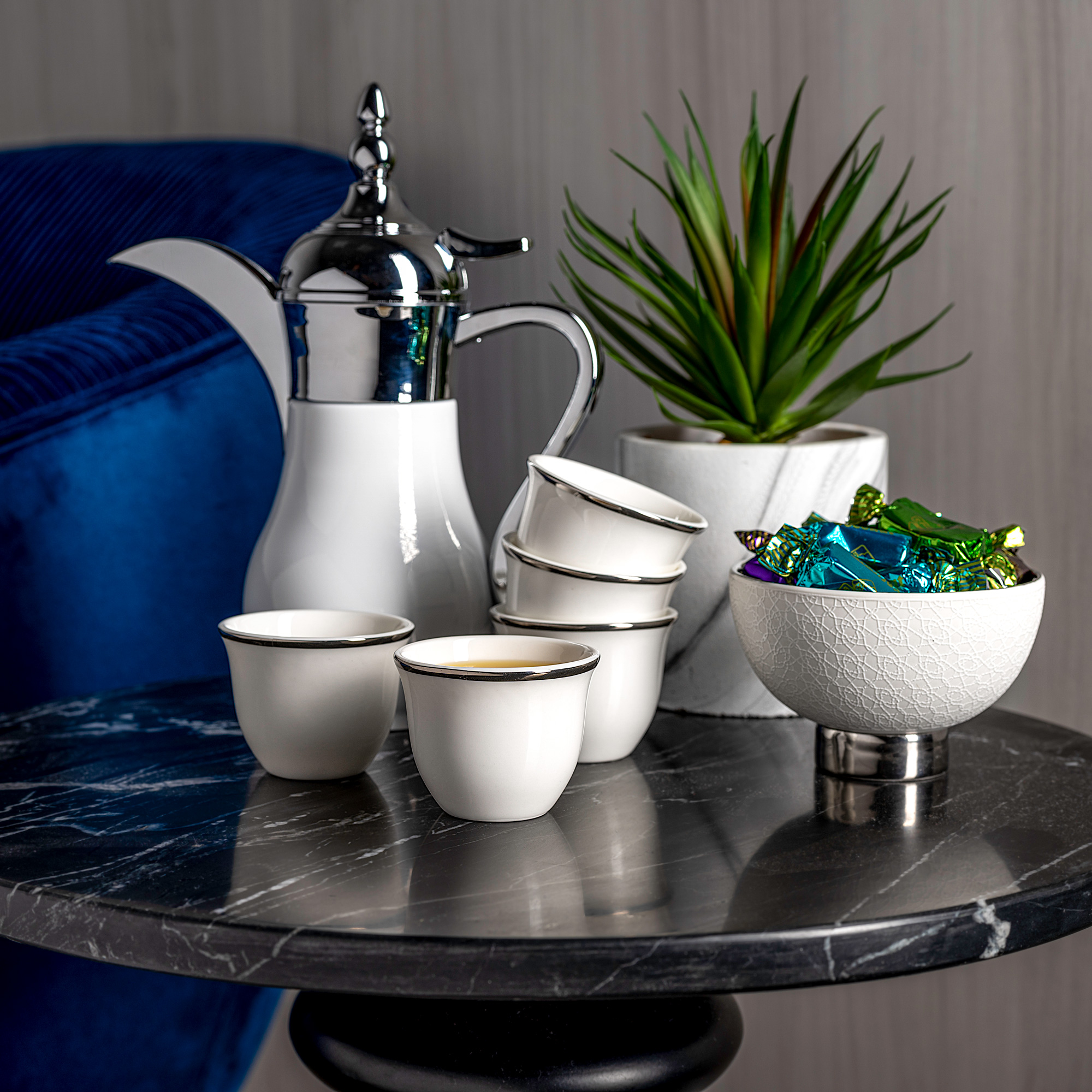 التصميم البسيط والأنيق باللون الأبيض يسهل عليكِ استخدامها مع أي دلة. يتكون الطقم من 12 فنجان قهوة عربية فاخرة مزيّنة بخط فضي رفيع على الأطراف.