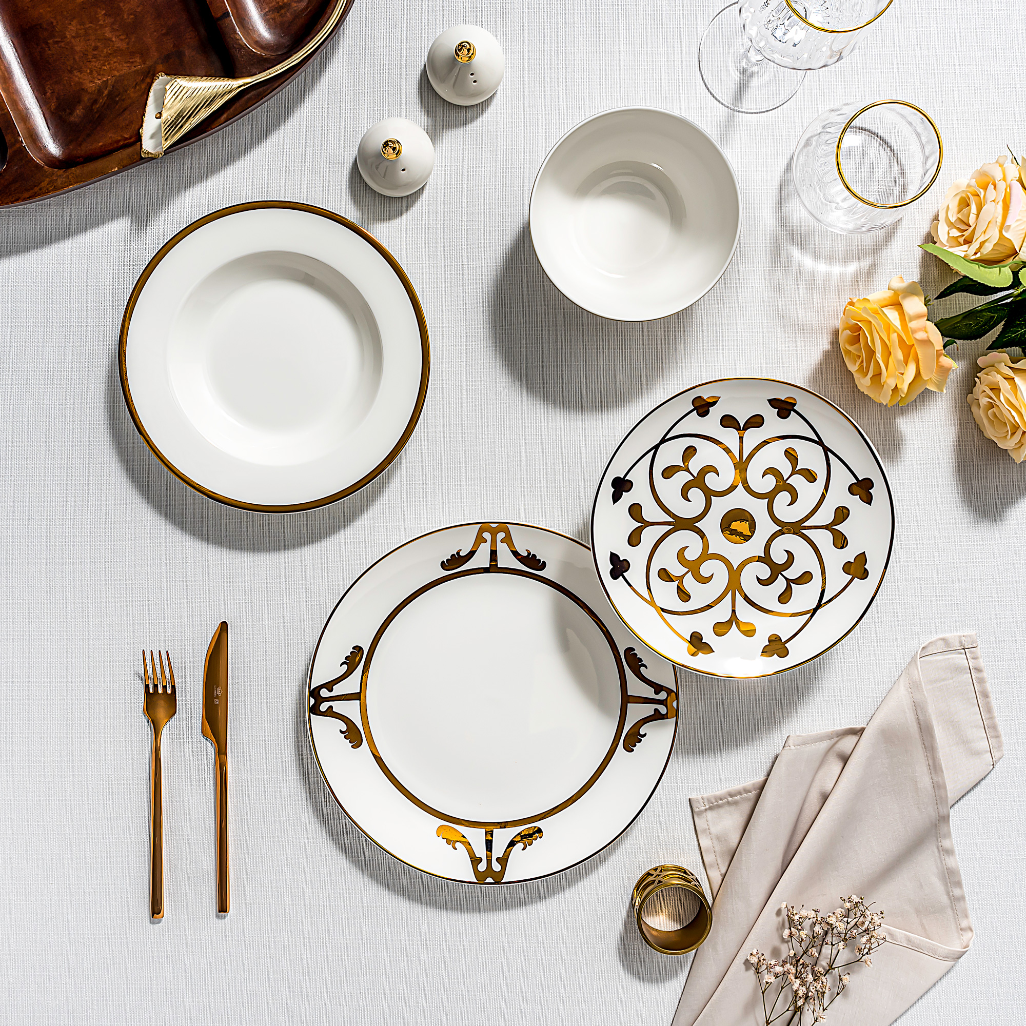 يتميز طقم المائدة الفاخر من لا ميسا بطباعة كلاسيكية أنيقة باللون الذهبي مما يجعلها إضافة مميزة لسفرة طعامك. الطقم ملائم لأربعة أشخاص ويتكوّن من 4 صحون طعام، 4 زبديات، 4 صحون جانبية و4 صحون عميقة.