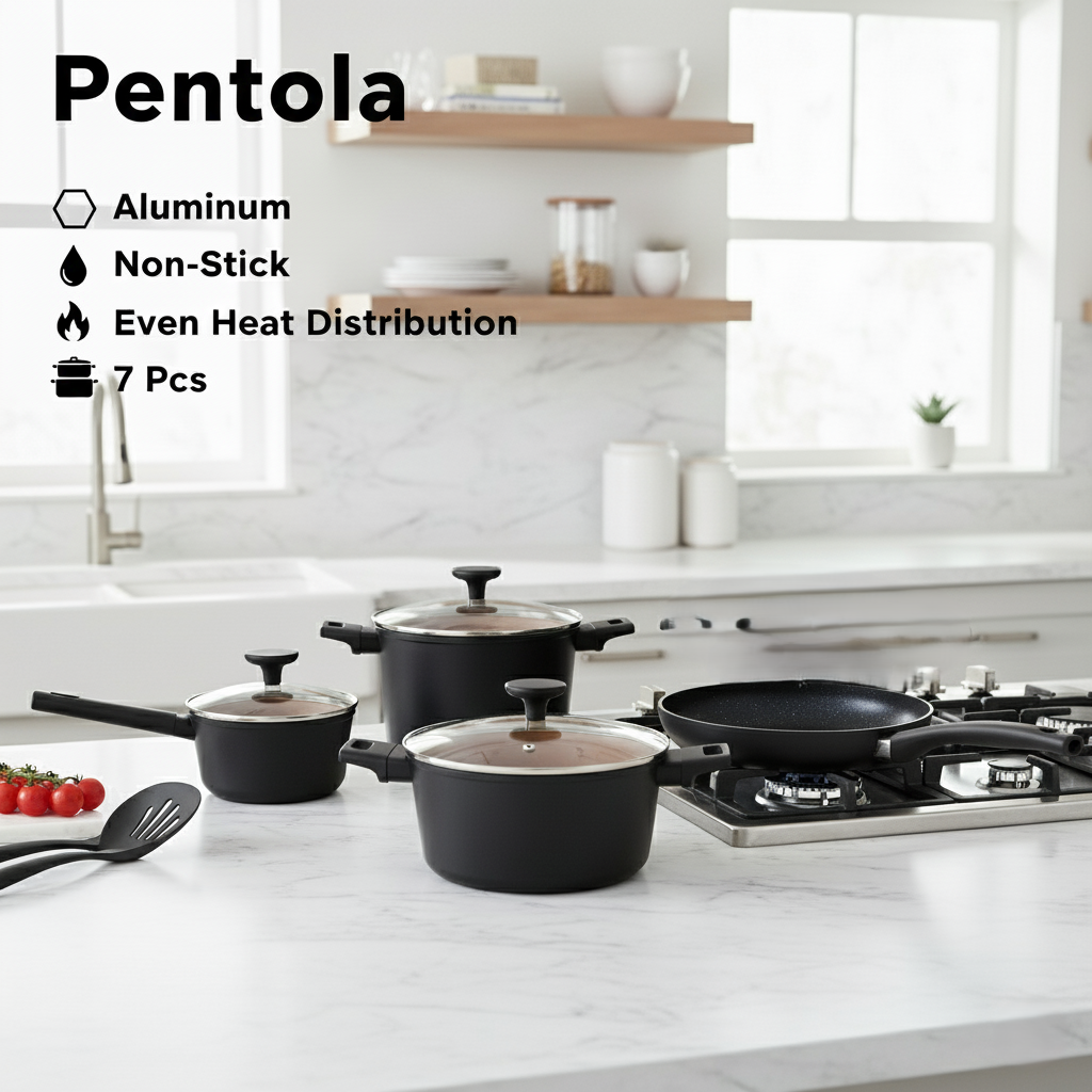 أضف لمسة عصرية إلى مطبخك مع طقم قدور الطبخ من بنتولا بلون أسود مطفي. يتكون من 7 قطع عملية مصنوعة من الألومنيوم بسطح غير لاصقة.