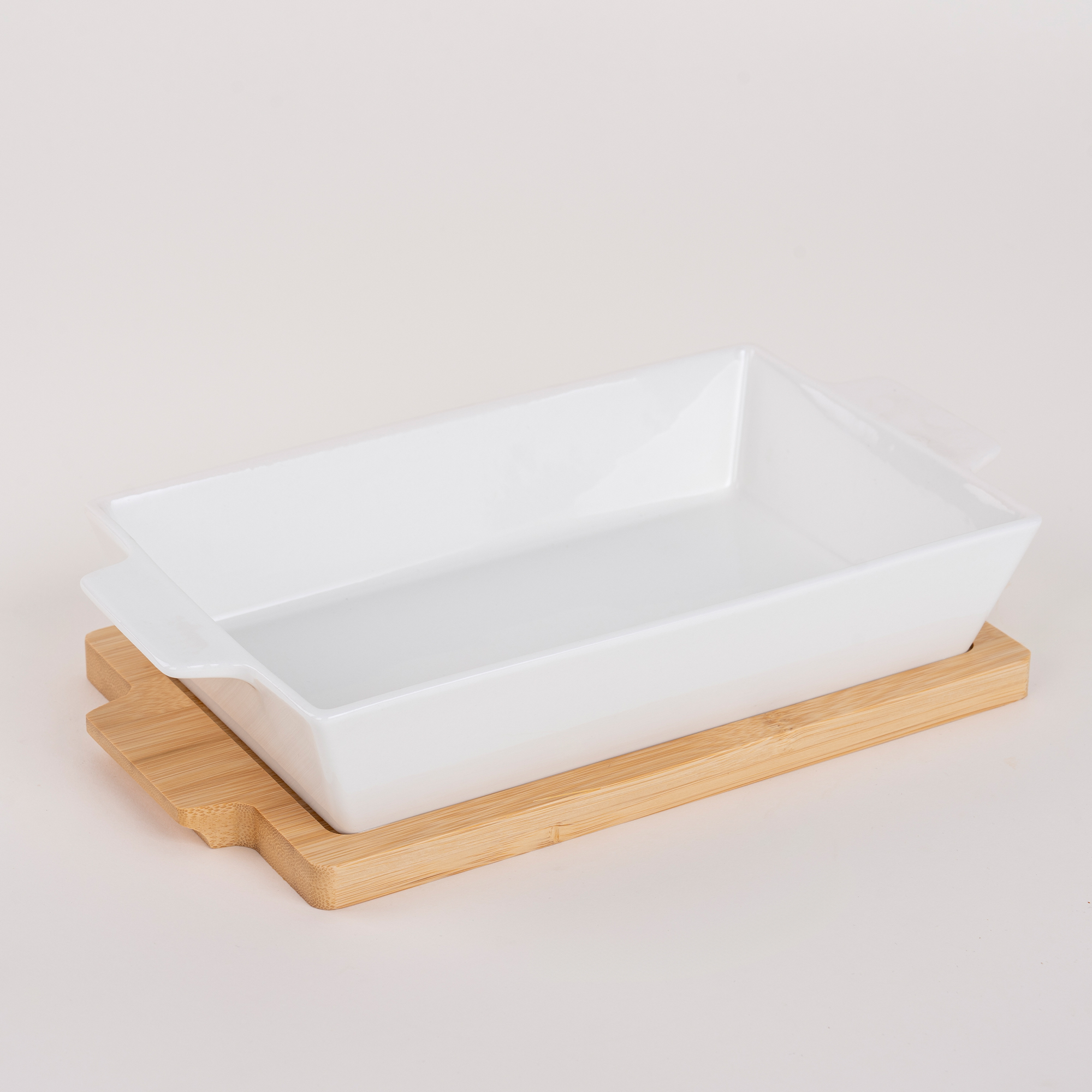 طبق فرن/تقديم بورسلان بقاعدة من الخيزران
