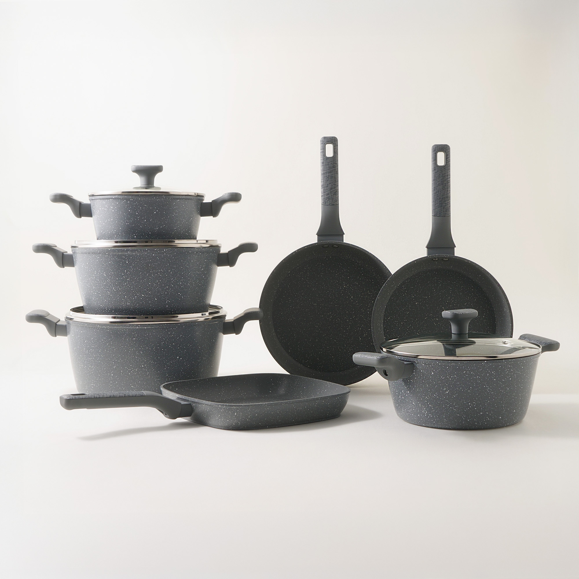 Alberto 11pcs forged aluminum cookware set in grey with white dots is perfect for versatile everyday cooking. The set includes 4 casseroles with glass lids (20*9cm, 24*11cm, 26*13cm, 28*14cm), 2 frypans (24*4.5cm, 26*5.2cm), and 1 grill pan (26*26*4cm). Made of durable aluminum with a cream and brown finish, and equipped with safe bakelite handles, this set combines practicality and modern elegance for your kitchen.