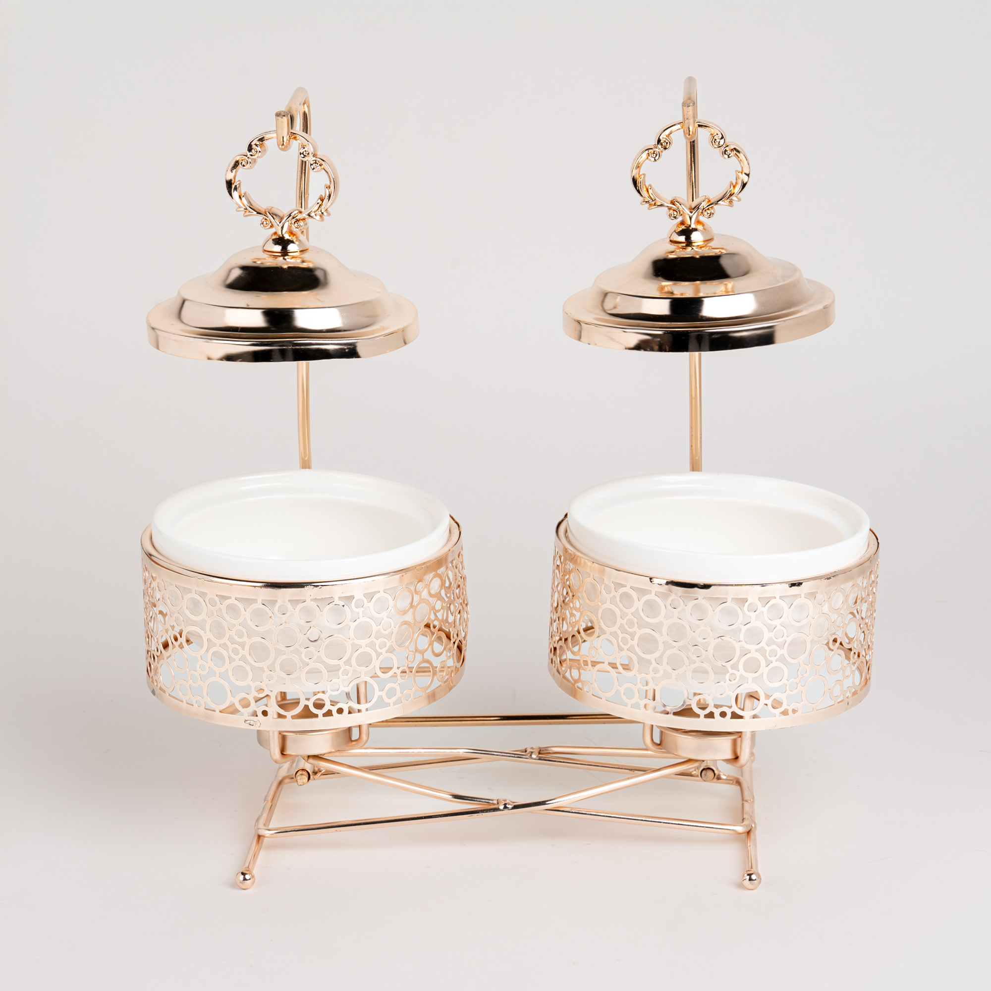 2 pieces Round Food Warmer Set With Candle Stand Gold 12 cm
