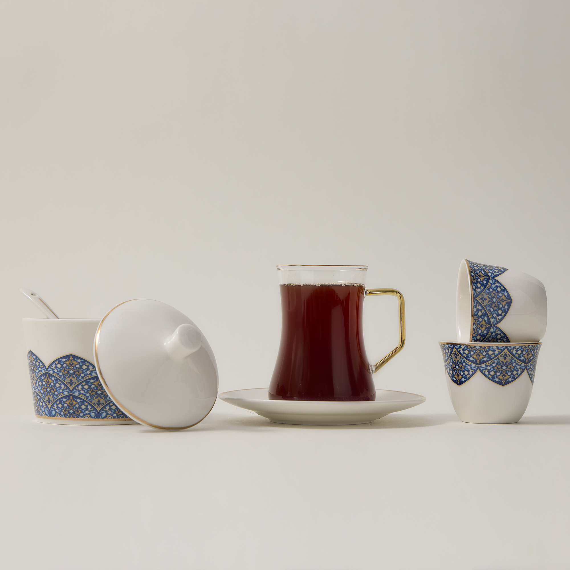 Set Includes 6 Teacups, 6 saucers, 6 pcs coffee cups, sugar pot, spoon