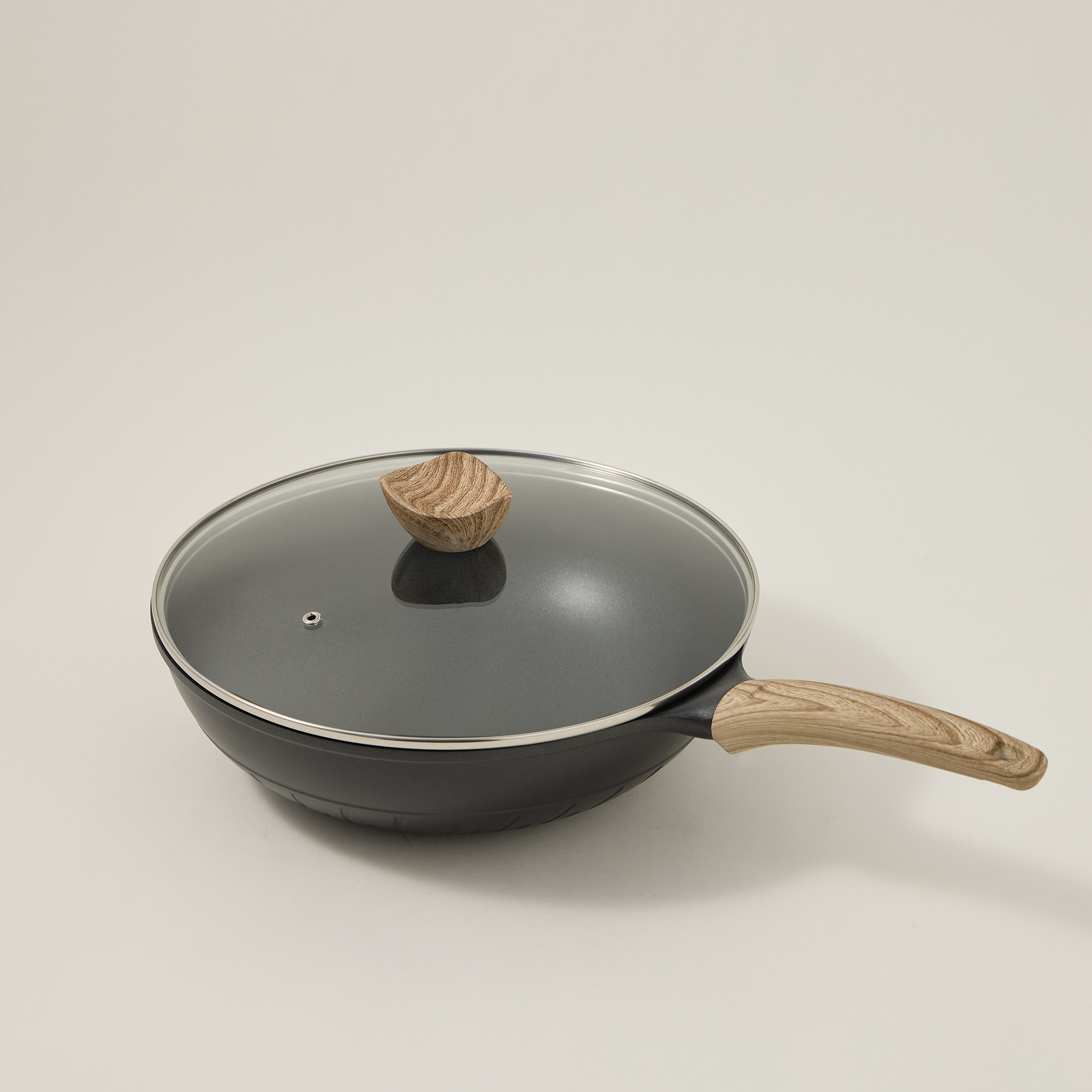 Alberto wok pan measuring 30cm distributes heat evenly, helping you to prepare food effortlessly, and the non stick surface makes cooking and cleaning easy and quick. Designed in black color, with wooden handle and glass lid.
