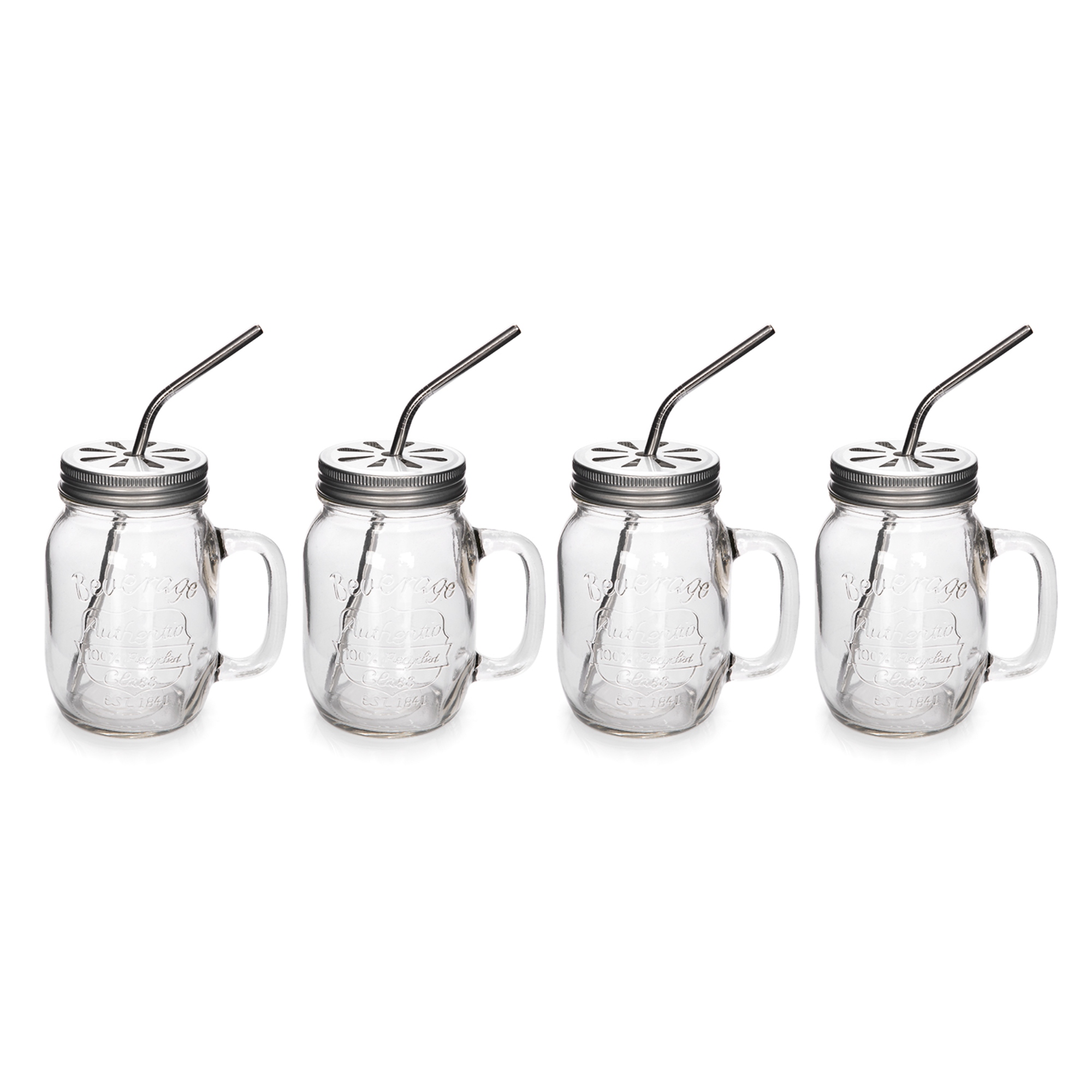 Serve up summer drinks in style with this 4 pack of clear glass drinking jars. Each jar comes with a metal screw top lid and a matching straw with stopper to prevent it falling out.