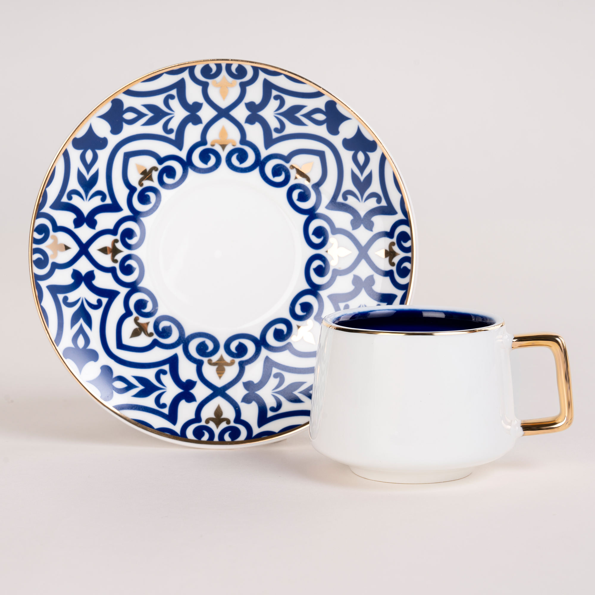 The Turkish coffee holds a special place in the world of coffee, which is why we present to you, with Dallaty, a Turkish coffee cups set made of porcelain that combines ancient traditions with elegant design. The set consists of 12 pieces, 6 white coffee cups with blue interiors and golden handles and rims. It also includes 6 white saucers adorned with golden and blue patterns. Enjoy the delightful taste of Turkish coffee with Dallaty.
