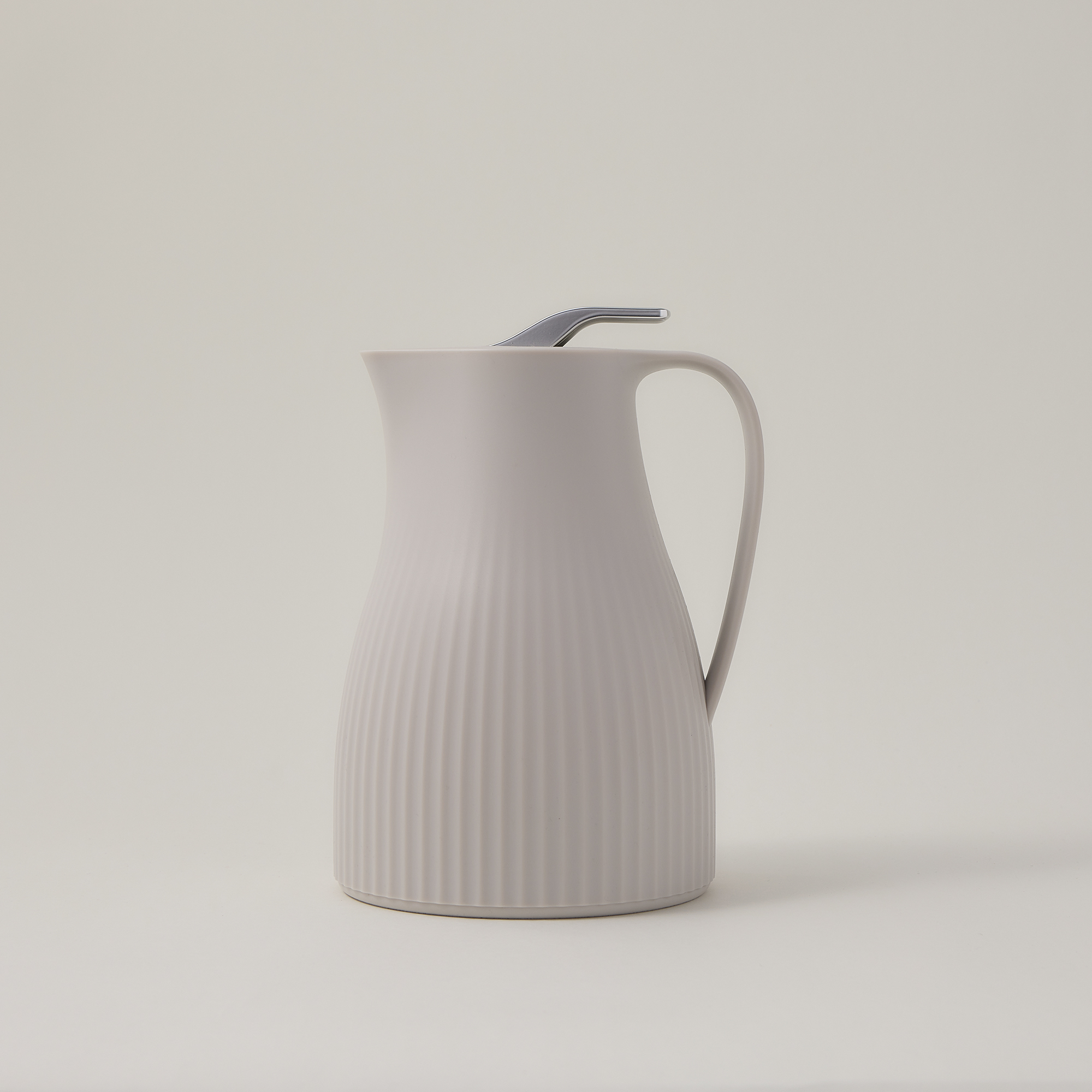 This 1L vacuum flask from Dallaty features a unique modern design. Made of high quality gray plastic and decorated with longitudinal patterns, fitted with an airtight lid with a silver push button to keep drinks warm.