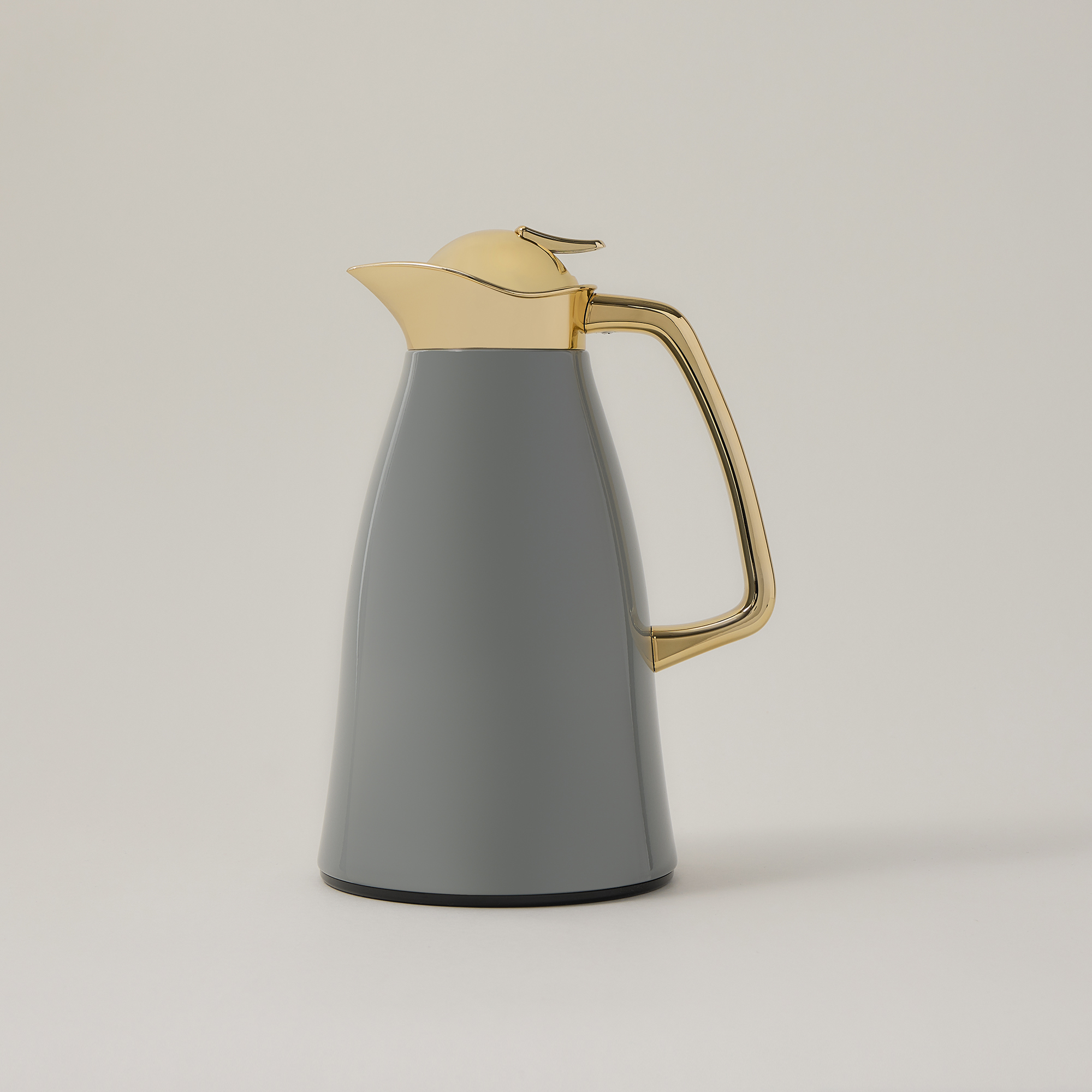Enjoy your tea & coffee with Dallaty stainless steel vacuum flask in a stunning chrome and grey finish. Crafted from high quality steel. This 1 liter flask offers exceptional functionality for both hot and cold drinks. Its sleek design with gold and chrome accents, makes it a standout accessory. This flask is a must whether you're on an outdoor adventure, or everyday use.