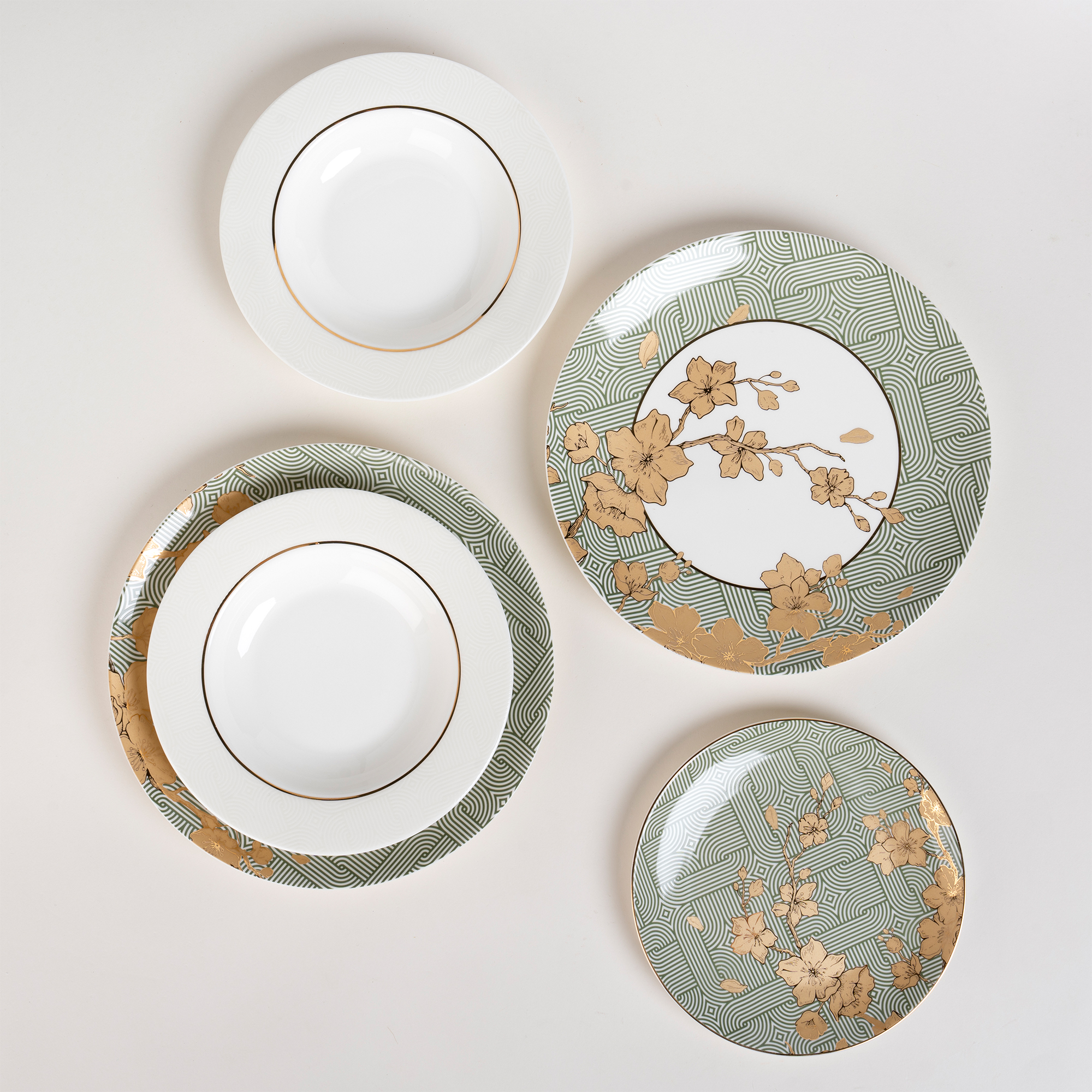 Elevate your dining experience with La Mesa green porcelain 18 pcs dinner set. Crafted with precision, the set includes six 10.5" dinner plates, six 8.5" soup plates, and six 8" side plates,—all designed for sophistication. This set effortlessly combines style and functionality. The freezer safe feature adds convenience to style. La Mesa dinnerware embraces luxury and practicality in every dining occasion.