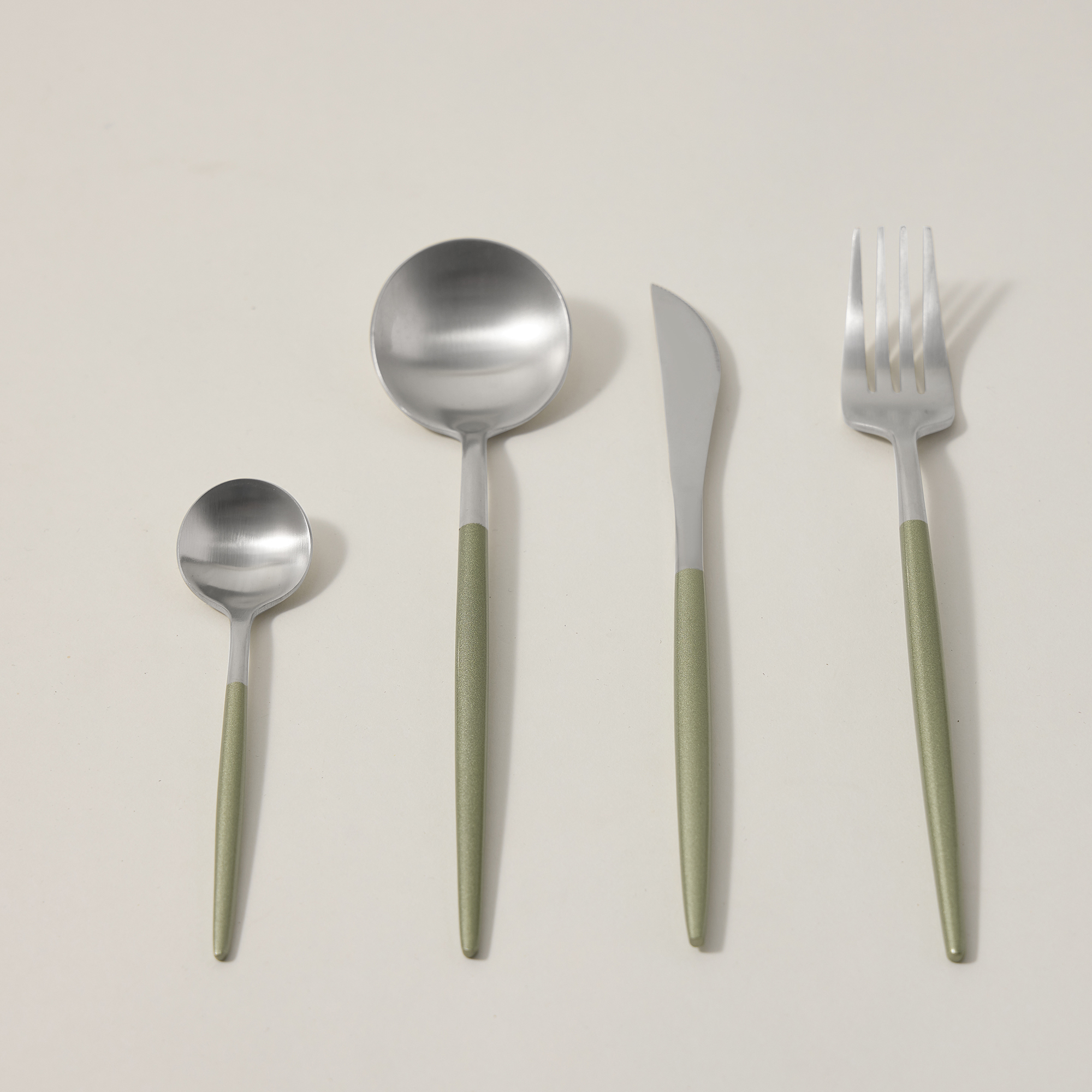 The cutlery set from Rio features a stylish modern design, and the silver and matte green tones gives it a unique contrast. The set consists of 16 pieces including spoons, forks, knives and teaspoons.