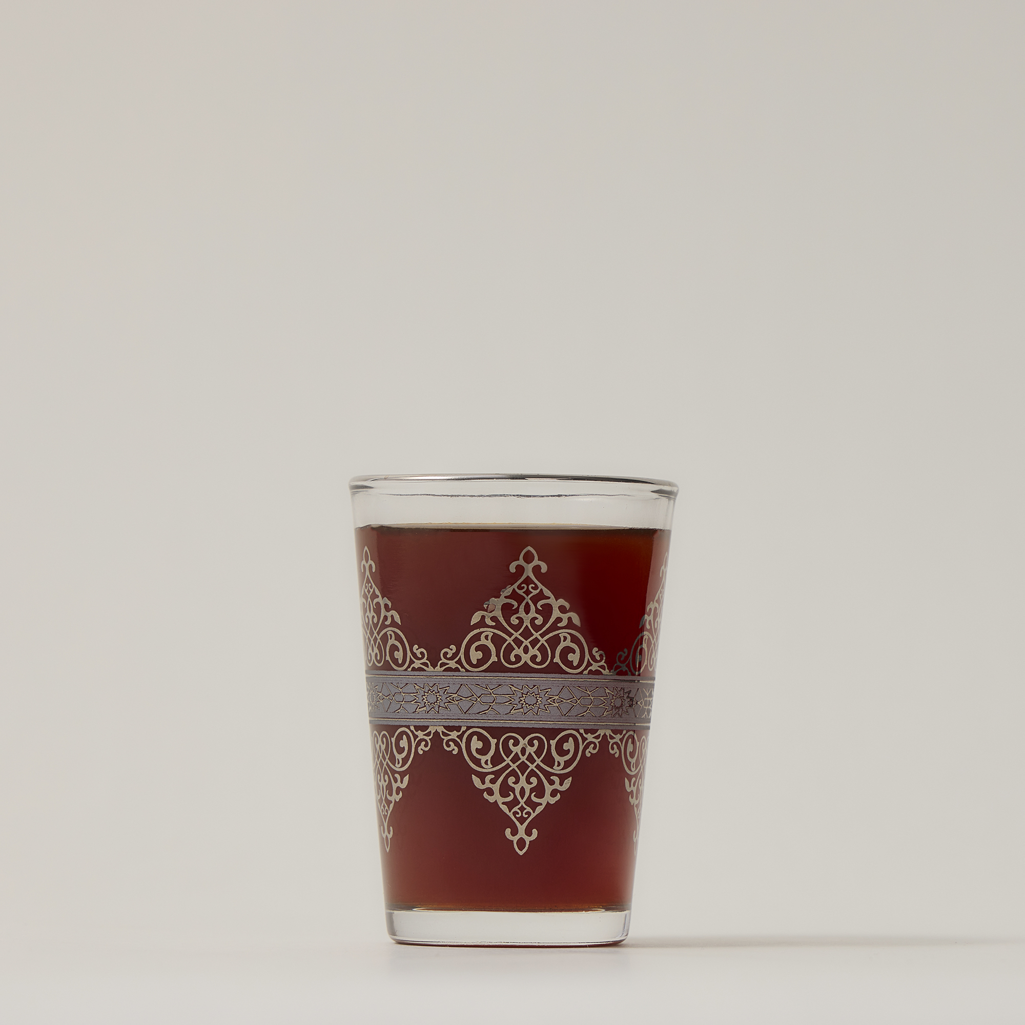 These Moroccan tea cups feature heat resistant transparent glass and a strikingly unique design. The set consists of six 6oz glasses decorated with elegant silver patterns and fine lines on the edges.